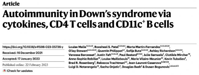 Malle:305-314. L, Patel RS, Martin-Fernandez M, Stewart OJ, Philippot Q et al. Autoimmunity in Down's syndrome via cytokines, CD4 T cells and CD11c+ B cells. Nature. 2023;615(7951)