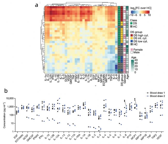 Luminex檢測(cè)結(jié)果發(fā)現(xiàn)了三分之一DS患者的細(xì)胞因子表達(dá)失調(diào)(圖1a),相比健康對(duì)照,其中22個(gè)升高了2000倍,包括IL-13、IL-4、TNFβ、IL-6和IL-1α。細(xì)胞因子在DS患者相隔5個(gè)月和10個(gè)月的血液中的表達(dá)都是高度穩(wěn)定的(圖1b),同時(shí)研究結(jié)果表明了DS患者體內(nèi)的細(xì)胞因子水平和新冠肺炎患者相似,存在穩(wěn)定、長(zhǎng)期的擾動(dòng),所以DS也可以被認(rèn)為是一種細(xì)胞因子病。