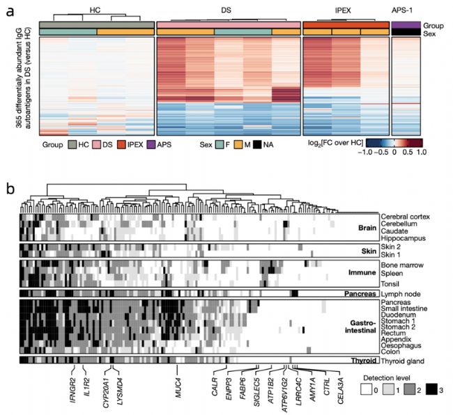 根據(jù)DS患者臨床的自身免疫表現(xiàn)以及對(duì)細(xì)胞因子和具有自身免疫傾向性B細(xì)胞的發(fā)現(xiàn),進(jìn)一步探索DS是否會(huì)導(dǎo)致自身抗體的產(chǎn)生。采用人類蛋白質(zhì)組芯片,檢測(cè)了健康個(gè)體、DS、多內(nèi)分泌腺自身免疫綜合征-1(APS-1)、X性連鎖多內(nèi)分泌腺病、腸病伴免疫失調(diào)綜合征(IPEX)患者血漿的自身抗體譜。與健康個(gè)體相比,DS、APS-1和IPEX中差異顯著的自身抗原(fold change > 2, P < 0.05)分別有365、257和829個(gè),表明DS的自身免疫程度與真正的自身免疫性疾病相似。而大部分的DS自身抗原與IPEX(由調(diào)節(jié)性T細(xì)胞(T reg)缺陷引起的嚴(yán)重的多器官炎癥綜合征)存在高度相似性,表明T細(xì)胞過(guò)度活化可能是DS中自身免疫B細(xì)胞激活的驅(qū)動(dòng)因素(圖3a)。通過(guò)HPA數(shù)據(jù)庫(kù)溯源DS患者特異的的自身抗原,發(fā)現(xiàn)了這些自身抗原表達(dá)在多個(gè)器官組織,例如大腦細(xì)胞、免疫細(xì)胞、胃腸道細(xì)胞和皮膚細(xì)胞等,說(shuō)明了DS患者具有系統(tǒng)性的疾病特征(圖3b)。綜上所述,本研究在DS患者血漿中檢測(cè)到了顯著的自身抗體圖譜,并結(jié)合B細(xì)胞和T細(xì)胞的活化過(guò)程,說(shuō)明了廣泛的體液免疫會(huì)使DS患者形成高親和力的組織特異性抗體,這些抗體在臨床上就表現(xiàn)為自身免疫性疾病。