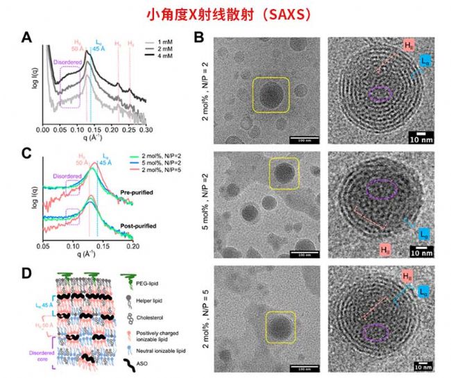 SAXS是指當(dāng)X射線透過樣品時,在靠近原光束2°~5°的小角度范圍內(nèi)發(fā)生的散射現(xiàn)象。X射線穿過樣品時,在不均一材料電子密度起伏的作用下,會發(fā)生散射并形成特定的散射圖案,根據(jù)所得圖案可反推樣品微觀結(jié)構(gòu)。在進(jìn)行mRNA-LNP表征時,SAXS常與Cryo-EM結(jié)合使用,正如圖3所示,結(jié)合SAXS檢測所得曲線與Cryo-EM拍攝所得圖像,即可幫助研究者推斷/驗證諸多信息,如LNP的多層狀結(jié)構(gòu),各種脂質(zhì)的排布,純化前后脂質(zhì)排布的變化及不同脂質(zhì)濃度、不同NP比對脂質(zhì)排布的影響。