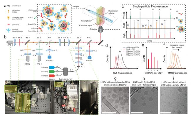 在包封分析中,SPP通過測量mRNA和脂質(zhì)染料的共現(xiàn)信號(圖5f),可以對單個LNP中mRNA的含量進(jìn)行定量分析,以得到完整LNP的占比(圖5g),以及單個LNP的mRNA包封量(圖5h)。