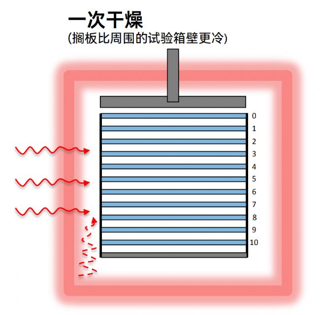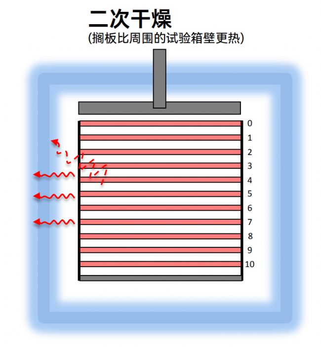 在二次干燥中,擱板被加熱到室溫以上,因而導(dǎo)致相反的效果,邊緣西林瓶?jī)?nèi)藥液溫度相較于中心位置溫度會(huì)較低。