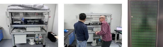 蘇州普芯應(yīng)用表面化學(xué)處理技術(shù)對玻片進(jìn)行修飾,然后使用英國ArrayJet公司的生物芯片點樣儀在玻片表面,進(jìn)行高密度固定小分子化合物(如下圖左),儀器一次可進(jìn)樣2304種樣品,點印100張玻片,同時配備質(zhì)控相機對結(jié)果進(jìn)行質(zhì)控。為了滿足不同樣本的點樣要求,儀器配有環(huán)境控制模塊,可對點樣的溫度和濕度進(jìn)行調(diào)節(jié)。公司CEO與ArrayJet廠家工程師進(jìn)行儀器方面交流(如下圖中),點樣結(jié)果使用熒光掃描儀進(jìn)行檢測(如下圖右)