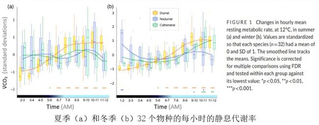 夏季晝夜物種平均每小時(shí)V̇CO2從05:00–06:00(日出前不久)開始顯著上升,并且在測量結(jié)束時(shí)(12:00)仍然保持高位(FIGURE1)。夜行性和無規(guī)律晝夜性物種在測量過程中的任何時(shí)候都沒有表現(xiàn)出升高的代謝率。冬季晝夜物種的平均標(biāo)準(zhǔn)化每小時(shí)代謝率從05:00-06:00(日出前不久)上升,并在12:00時(shí)仍然保持高位。從09:00-10:00開始,無規(guī)律晝夜性物種的代謝率顯著上升,并且在測量結(jié)束時(shí)仍然保持高水平。在01:00-02:00測量的第一個(gè)小時(shí)內(nèi),夜行性物種的代謝率較高,在10:00-11:00時(shí)出現(xiàn)另一個(gè)小高峰。