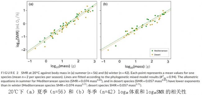 在兩個(gè)季節(jié)測量的32個(gè)個(gè)體(每個(gè)個(gè)體代表一個(gè)物種)中,29個(gè)個(gè)體的代謝率在冬季相對于夏季,在12℃和20℃下都降低了。冬季20℃質(zhì)量校正SMR平均比夏季SMR低46.6%(95%CI:40.9%–51.7%,n=32,R2