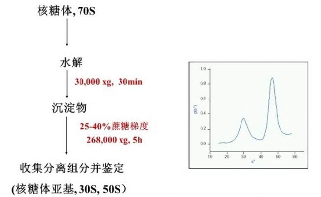 速率區(qū)帶離心經(jīng)典的應(yīng)用就是通過蔗糖密度梯度離心,進(jìn)行各種亞細(xì)胞器(核糖體、線粒體、Exosome 等)和病毒顆粒(病毒載體、疫苗等)的純化。例如,我們在上一期中得到的 70S 核糖體沉淀,經(jīng)過水解后,可利用蔗糖密度梯度離心,進(jìn)一步分離純化得到 50S 和 30S 的兩個亞基。具體的實(shí)驗(yàn)流程如下: