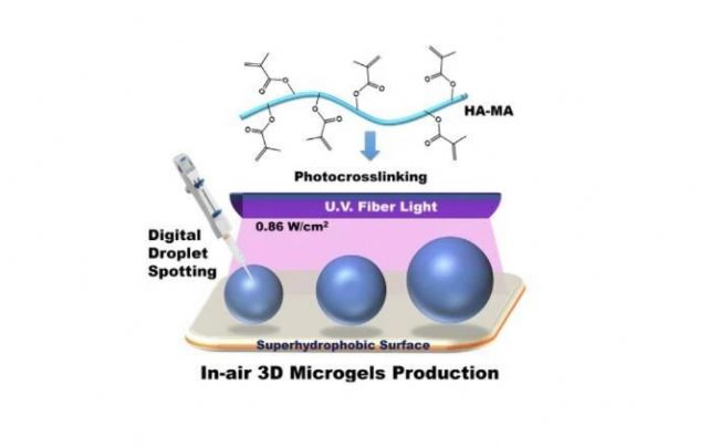 方法:在超疏水聚苯乙烯修飾的界面上,利用HAMA和GelMA光交聯(lián),復(fù)合構(gòu)建微凝膠生物反應(yīng)器。