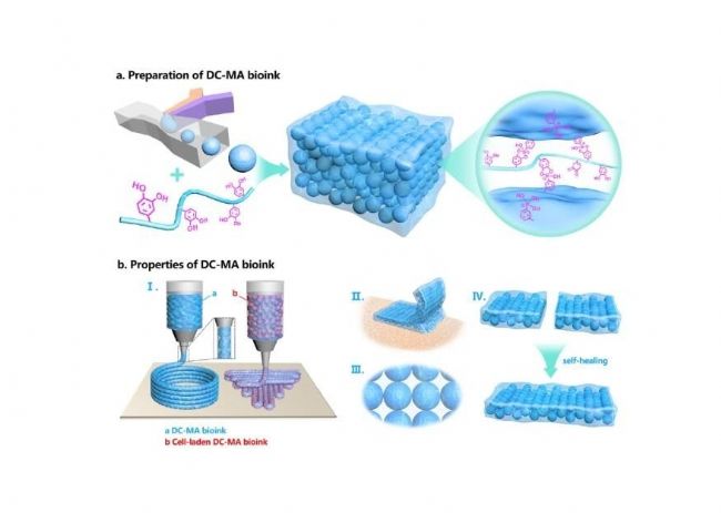 結(jié)果:具有高形狀保真度的2D和3D結(jié)構(gòu)可以在無(wú)需后處理的情況下打印,并且封裝的L929細(xì)胞在擠壓后表現(xiàn)出高的細(xì)胞活力。此外,動(dòng)態(tài)交聯(lián)劑(HA-DA)的加入還改善了DC-MA生物墨水的微孔、組織粘附和自愈合性能,有望應(yīng)用于組織工程和再生醫(yī)學(xué)(如創(chuàng)面愈合等)領(lǐng)域。