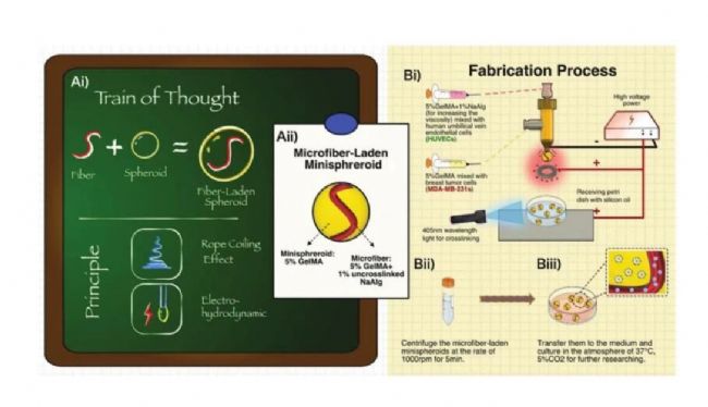 結(jié)果:該技術(shù)應(yīng)用同軸生物打印和電噴墨技術(shù),并利用多組分流體流動(dòng)時(shí)的“懸繩效應(yīng)”,實(shí)現(xiàn)了帶復(fù)雜纖維結(jié)構(gòu)的微球制造,并將其應(yīng)用于細(xì)胞3D共培養(yǎng)。