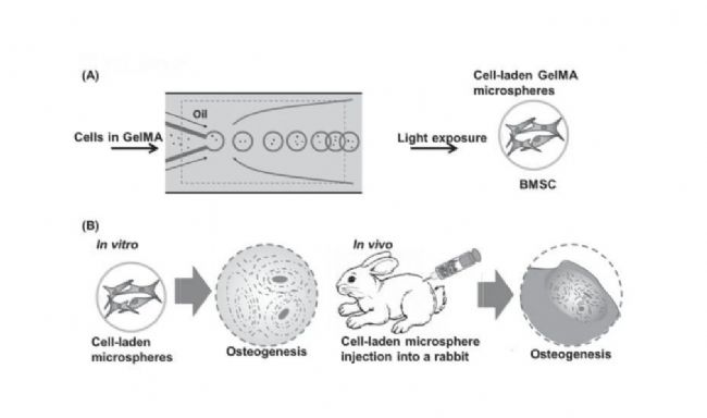 方法:使用毛細(xì)微流體裝置制備了負(fù)載BMSCs 和BMP-2的GelMA單分散液滴,將液滴暴露在紫外光下,使聚合物聚合,形成凝膠微球。