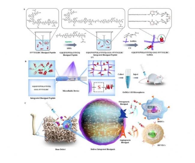 方法:基于微流控技術(shù),首先通過(guò)固相合成方法偶聯(lián)成骨和血管生成信號(hào)肽,構(gòu)建集成生物信號(hào)肽系統(tǒng)(SVVYGLR-BFP),然后通過(guò)巰基和雙鍵的點(diǎn)擊反應(yīng)(GelMA-S-B)交聯(lián)成由GelMA組成的生物信號(hào)集成微凝膠。
