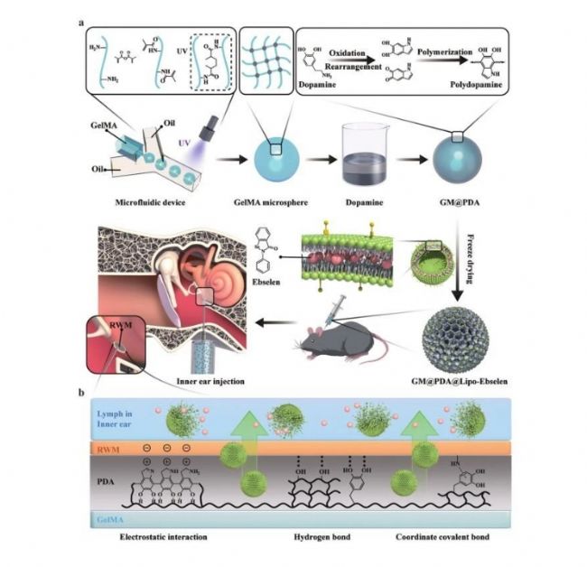 方法:利用GelMA微球(GM)耦合PDA層(GM@PDA),將具有優(yōu)異粘附能力的Ebselen脂質(zhì)體進(jìn)一步裝載到載體中構(gòu)建了GM@PDA@Lipo Ebselen。