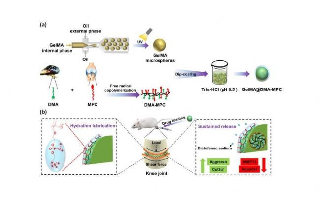 方法:首先通過(guò)微流控技術(shù)制備得到光交聯(lián)GelMA水凝膠微球,然后通過(guò)自由基聚合得到自粘聚合物DMA-MPC,最后通過(guò)浸涂法得到潤(rùn)滑性微球(GelMA@DMA-MPC),并負(fù)載消炎藥雙氯酚酸鈉(DS)。