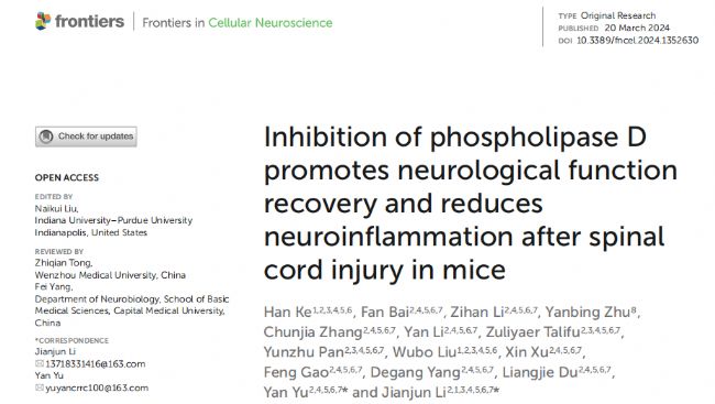 【Frontiers in Cellular Neuroscience】Inhibition of phospholipase D promotes neurological function recovery and reduces neuroinflammation after spinal cord injury in mice
