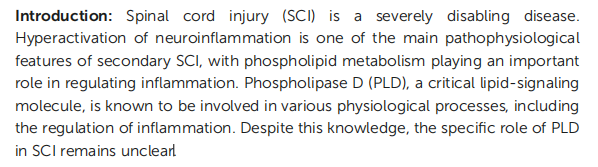 脊髓損傷(SCI)是一種嚴(yán)重的致殘性疾病,神經(jīng)炎癥的過(guò)度活化是繼發(fā)性脊髓損傷的主要病理特征之一,其中磷脂代謝在炎癥調(diào)節(jié)中起關(guān)鍵作用。磷脂酶D (Phospholipase D, PLD)是一種重要的脂質(zhì)信號(hào)分子,參與多種生理過(guò)程,包括炎癥調(diào)節(jié),但是PLD在SCI中的具體作用機(jī)制仍不清楚。