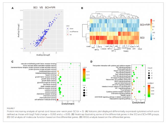 為了進(jìn)一步研究PLD在SCI中的作用,研究人員使用細(xì)胞因子芯片對(duì)假手術(shù)組、脊髓損傷組和脊髓損傷7天并給與PLD抑制劑FIPI組進(jìn)行分析,首先提取脊髓組織蛋白,并滴加到細(xì)胞因子微陣列芯片上,4℃ 孵育過(guò)夜,然后對(duì)載玻片進(jìn)行清洗,隨后加入一抗室溫孵育2小時(shí),再進(jìn)行清洗,并加入Cy3 標(biāo)記的鏈霉親和素在室溫下避光孵育1小時(shí),清洗后使用法國(guó)Innopsys的InnoScan 300(新型號(hào)InnoScan 710)熒光掃描儀進(jìn)行熒光信號(hào)分析,其中共檢測(cè)了200種不同的細(xì)胞因子表達(dá)水平。結(jié)果:SCI和SCI+FIPI組中有71種細(xì)胞因子表達(dá)存在差異,炎癥相關(guān)因子在SCI+FIPI組表達(dá)顯著下調(diào),包括腫瘤壞死因子以及炎癥相關(guān)信號(hào)通路(TNF信號(hào)通路和NF-κB信號(hào)通路)。這表明FIPI在蛋白水平上對(duì)脊髓損傷具有一定的抗炎作用。