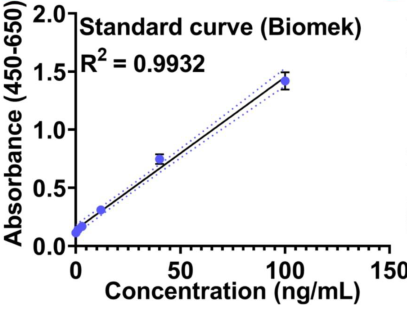 圖2. 使用CygnusTM CHO HCP ELISA 試劑盒對于自動化再現(xiàn)性的驗證。手工和自動化的標(biāo)曲比較結(jié)果如圖二A和B所示,對比R2的數(shù)值自動化動化結(jié)果更好。