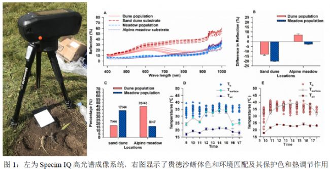 該研究運(yùn)用北京易科泰生態(tài)技術(shù)公司提供的Specim IQ便攜式高光譜成像技術(shù)方案,采集分析了高原蜥蜴(Phrynocephalus putjatai)在不同背景環(huán)境條件下的400-1000nm高光譜成像數(shù)據(jù),并對(duì)其體色變化進(jìn)行了分析。結(jié)果發(fā)現(xiàn),青海湖邊溫暖沙丘和寒冷草甸的貴德沙蜥在體表光譜反射方面呈現(xiàn)出明顯差異:溫暖沙丘種群的淺色貴德沙蜥具有較高的光譜反射率,而寒冷草甸種群的深色貴德沙蜥則反射率較低。