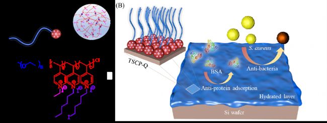 圖4 (A) TSCP-Q的化學(xué)結(jié)構(gòu);(B) TSCP-Q接枝后的硅片表面具有良好的“生物防污”功能。