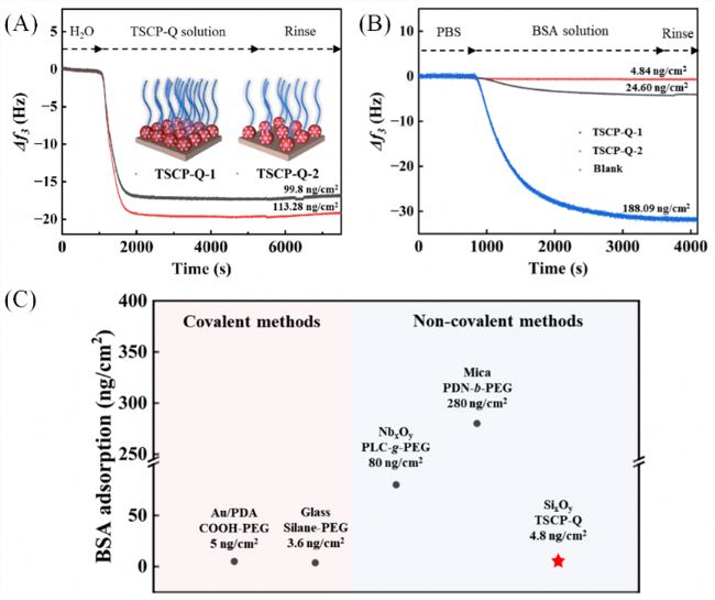 圖5 (A) TSCP-Q在在氧化硅芯片表面的吸附動力學(xué)曲線;(B) BSA在TSCP-Q刷表面的吸附動力學(xué)曲線;(C)TSCP-Q刷抗蛋白粘附的性能比較圖。