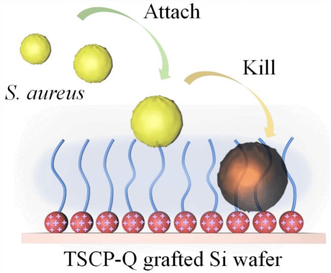 利用(S. aureus)對TSCP-Q接枝的硅片表面進(jìn)行抗菌評價。由于TSCP-Q的“尾部”PEG能夠動態(tài)穿透細(xì)胞膜,并促進(jìn)細(xì)菌與TSCP-Q“頭部”的高密度季銨鹽接觸,所以TSCP-Q修飾的硅片對S. aureus體現(xiàn)出良好的抗菌性(81%)(圖7, 8)。
