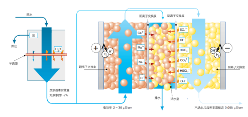 其次,CEDI技術(shù)無(wú)需使用酸和堿對(duì)離子交換樹脂進(jìn)行再生。避免了酸堿藥劑的使用和廢液的產(chǎn)生,極大地提高了環(huán)保性能。