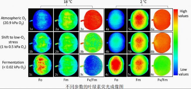 成像測量結(jié)果表明,隨著氧含量下降,F(xiàn)o升高,尤其在<0.02KPa的發(fā)酵階段,F(xiàn)o顯著升高。而Fv/Fm(暗適應(yīng)下的最大光量子通量)隨著氧含量的下降而降低,說明低氧脅迫引起了蘋果光合效率的下降。
