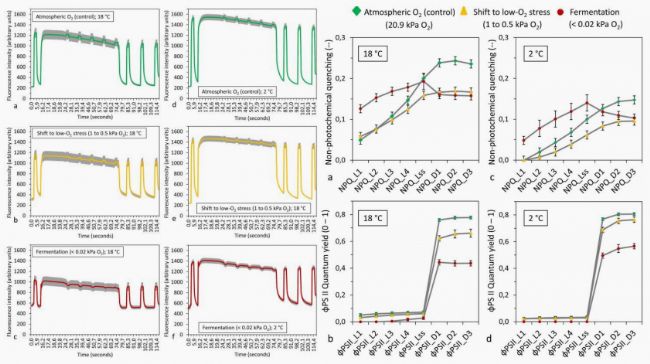 同時,對通過FluorCam獲得的熒光動力學(xué)曲線分析發(fā)現(xiàn),在有氧和低氧發(fā)酵條件下,熒光動態(tài)曲線存在差異。在發(fā)酵條件下,飽和脈沖期間熒光強度下降。尤其在2°C的條件下,發(fā)酵產(chǎn)物積累之前,熒光動態(tài)曲線就已經(jīng)發(fā)生變化。