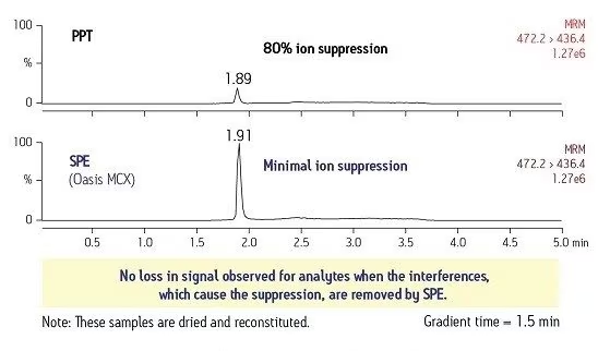 有時(shí),樣品基質(zhì)中的干擾物會人為增加化合物信號的報(bào)告值。這種現(xiàn)象稱為離子增強(qiáng)效應(yīng),會導(dǎo)致誤報(bào)偏高的信號值。適當(dāng)?shù)腟PE方法可以清除化合物中的干擾物,盡可能減弱該效應(yīng),從而得到更準(zhǔn)確的報(bào)告值。