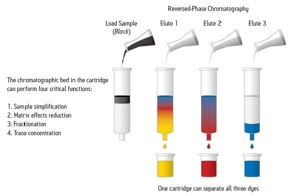 SPE是一項(xiàng)樣品前處理技術(shù),采用固體顆粒色譜填料(通常裝于小柱型裝置中)對樣品的不同組分進(jìn)行化學(xué)分離。樣品幾乎總是處于液態(tài)[盡管一些特殊應(yīng)用可能會使用一些氣相樣品]。圖1所示為使用SPE裝置處理一個(gè)黑色樣品,以便對組成該樣品的各染料化合物進(jìn)行色譜分離。