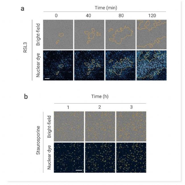 RSL3 (0.15 μM) (a) 或 Staurosporine (0.15 μM) (b) 處理的 RPE-1 細(xì)胞中細(xì)胞死亡的延時(shí)圖像。顯示為明場和核染料熒光圖像與細(xì)胞死亡輪廓(橙色輪廓)疊加。