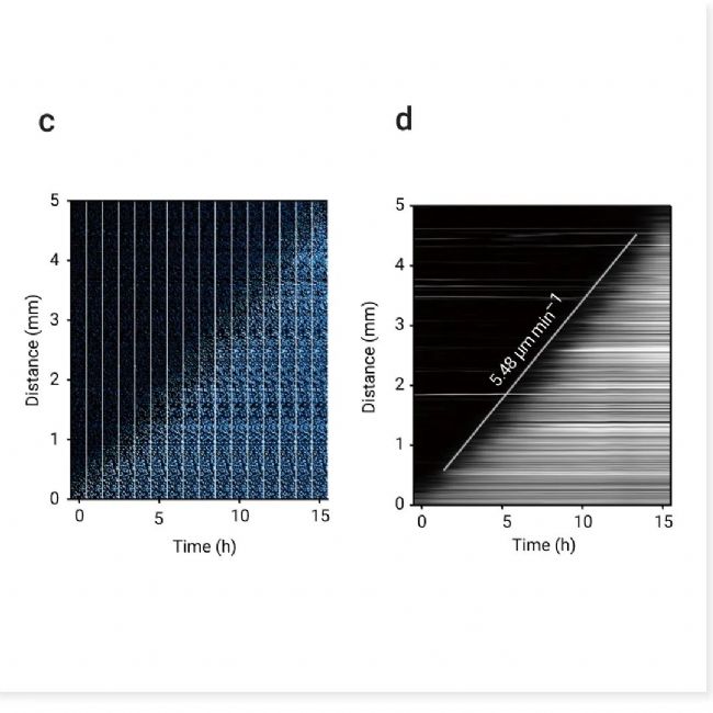 a-b. 鐵死亡從光誘導(dǎo)區(qū)域(紅色圓圈)開始,并在 18 小時(shí)內(nèi)傳播至 5 毫米內(nèi)經(jīng) Erastin 處理的細(xì)胞。輪廓(白色輪廓)表示特定時(shí)間點(diǎn)細(xì)胞死亡的邊界。a. 核染料熒光圖像(光誘導(dǎo)后 11 小時(shí))與光誘導(dǎo)后 2-18 小時(shí)的輪廓疊加。b. 光誘導(dǎo)后細(xì)胞死亡的延時(shí)圖像,顯示 a 中橙色框的放大視圖。細(xì)胞破裂(明場)和核染料熒光增加(青色至白色)表示細(xì)胞死亡。c-d:數(shù)據(jù)來自 a,c:鐵死亡傳播的延時(shí)圖像陣列。d:鐵死亡傳播的動(dòng)態(tài)圖。