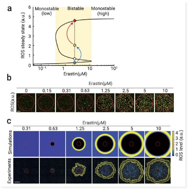 a、計(jì)算機(jī)模擬顯示 ROS 穩(wěn)態(tài)與 erastin 濃度的關(guān)系。隨著 erastin 濃度的增加,ROS 穩(wěn)態(tài)從單穩(wěn)態(tài) (低) 分為雙穩(wěn)態(tài) (黃色區(qū)域)。穩(wěn)定的低和高 ROS 穩(wěn)態(tài)和 USS 分別用藍(lán)色、紅色和白色圓圈表示。光誘導(dǎo)引起的 ROS 升高 (藍(lán)色箭頭,從藍(lán)色圓圈升高到黃色圓圈) 使細(xì)胞超過 USS,高于 USS 時(shí) ROS 被放大(紅色箭頭)到高穩(wěn)態(tài)。b、在不同 Erastin 濃度下光誘導(dǎo) 20 分鐘后的 ROS 熒光圖像 (黃色)。c. 增加 Erastin 濃度會(huì)促進(jìn) ROS 波前傳播。光誘導(dǎo) 6 小時(shí)后用不同濃度 Erastin 處理的細(xì)胞群中 ROS 傳播的模擬 (頂部) 和實(shí)驗(yàn) (底部)。