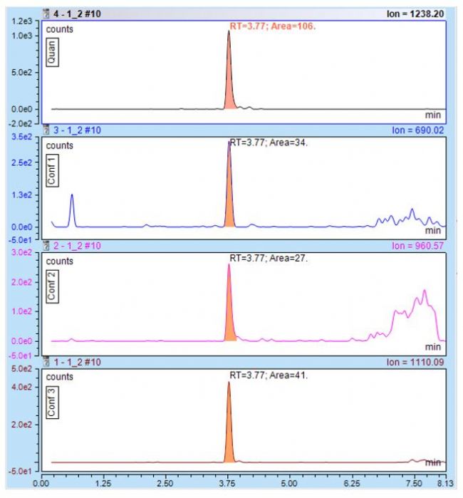 大多數(shù)多肽及核酸很難找到特征性的碎片離子,低能量下,沒(méi)有碎片離子生成,而高能量下又生成很多小的碎片離子;此時(shí)可以運(yùn)用SRM的母離子進(jìn)行定量或者SIM模式下抽提高響應(yīng)電荷態(tài)離子流來(lái)進(jìn)行定量。此時(shí)也同樣具備高的專屬性;多肽及核酸在進(jìn)行碎裂時(shí),往往會(huì)產(chǎn)生很多響應(yīng)很高但特異性不好的亞銨離子,這些離子會(huì)干擾SRM抽提離子通道的選擇,盡量不選擇低于200以下的,這些離子的通道的特異性差會(huì)有較高的背景干擾。