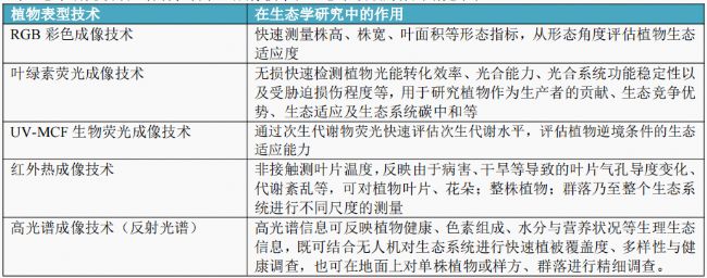 因此,基于植物表型組學(xué)研究需求而在近十年中逐漸開發(fā)完善的植物表型成像技術(shù)也同樣可以用于與生態(tài)學(xué)研究領(lǐng)域。各種植物表型成像技術(shù)在生態(tài)學(xué)領(lǐng)域的作用請(qǐng)見下表: