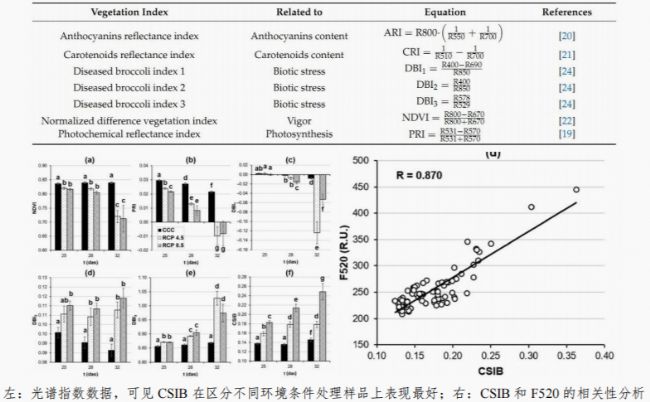 基于高光譜成像技術(shù),研究人員測(cè)量并計(jì)算了一系列與植物色素、脅迫、活力、光合相關(guān)的植被指數(shù),如花青素指數(shù)ARI、類胡蘿卜素指數(shù)CRI、生病花椰菜指數(shù)DBI、歸一化植被指數(shù)NDVI和光化學(xué)反射指數(shù)PRI,并且根據(jù)研究結(jié)果提出了蕓薹屬氣候脅迫指數(shù)CSIB。這些參數(shù)指標(biāo)分別與色素含量、生物脅迫指示、活力、光合作用相關(guān)。與其他植被指數(shù)相比,CSIB在實(shí)驗(yàn)處理25天時(shí)即可很好地區(qū)分三種不同處理的樣品。進(jìn)一步的數(shù)據(jù)分析發(fā)現(xiàn),CSIB與F520有較強(qiáng)的相關(guān)性,暗示CSIB代表的植物生理特性也是與次生代謝有關(guān)的。