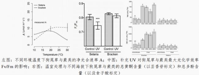 研究人員考慮海拔高度變化中,溫度和紫外光輻射是對(duì)植物生長(zhǎng)影響最大的兩個(gè)關(guān)鍵環(huán)境因素。在進(jìn)一步的溫室試驗(yàn)中,他們?cè)跍厥抑心M不同環(huán)境溫度并補(bǔ)充紫外光,同時(shí)用光合儀和FluorCam葉綠素?zé)晒獬上裣到y(tǒng)對(duì)在其中培養(yǎng)的狗尾草與蕨類光合作用進(jìn)行測(cè)量。結(jié)果發(fā)現(xiàn),狗尾草的凈光合速率要對(duì)低溫更敏感,而其光系統(tǒng)II最大光化學(xué)效率Fv/Fm在補(bǔ)充紫外光后顯著降低,這說(shuō)明其光系統(tǒng)活性被紫外光嚴(yán)重抑制。蕨類對(duì)溫度不敏感的光合作用及其對(duì)紫外線輻射的有效保護(hù)是其能夠在生態(tài)競(jìng)爭(zhēng)中獲得成功的原因。