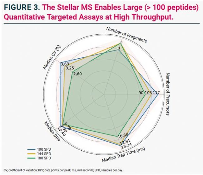 ■ 將P100檢測(cè)的通量提高到100 SPD、144 SPD和180 SPD,證明了Stellar 質(zhì)譜儀在高檢測(cè)通量下仍保持一致的定量性能。