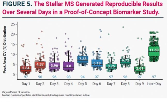 ■ 在完整血漿消化物中添加98個(gè)SIL肽的100 fmol數(shù)據(jù),突顯了Stellar MS在數(shù)日血漿蛋白質(zhì)組生物標(biāo)志物驗(yàn)證中的穩(wěn)健性和可重復(fù)性(圖5)。