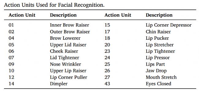 使用FaceReader分析面部表情,可以獲得六種基本情緒:快樂、悲傷、生氣、驚訝、害怕和厭惡,以及中性情緒。平均準(zhǔn)確率為99%。此外,F(xiàn)aceReader可以測量20個最常見的面部動作單位(Action Unit, AU),以0 ~ 1的取值表示其強(qiáng)度,以此獲得實(shí)時效價和喚醒度數(shù)據(jù)。效價的計(jì)算為快樂情緒強(qiáng)度減去強(qiáng)度最高的負(fù)面情緒強(qiáng)度,喚醒度的計(jì)算基于表1所示的20個動作單元的激活值。