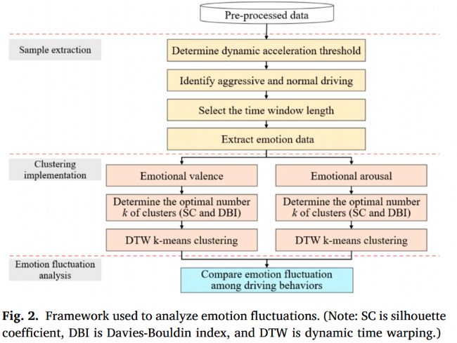 因此,本研究引入一個新的框架來分析不同駕駛行為的情緒波動差異。首先考慮情緒的不穩(wěn)定性,分析了情緒波動對駕駛行為的影響;其次,對情緒的描述關(guān)注兩個維度,即效價和喚醒度。通過分析駕駛員在真實(shí)駕駛過程中的面部表情視頻,得出這兩個指標(biāo)數(shù)據(jù),構(gòu)成實(shí)時、真實(shí)的數(shù)據(jù)集。最后,基于聚類方法得到的不同駕駛行為的情緒變化模式。這些模式可以用于在線監(jiān)測司機(jī)的情緒變化,從而提供給司機(jī)必要和及時的警告,減輕與情緒相關(guān)風(fēng)險行為。