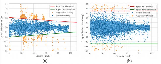 對于攻擊性駕駛行為的識別,參考過往研究使用VBOX采集的車輛運(yùn)動學(xué)數(shù)據(jù)中的速度、縱向加速度(急加速或急制動)和橫向加速度(急變車道和急轉(zhuǎn)彎)的閾值來檢測。