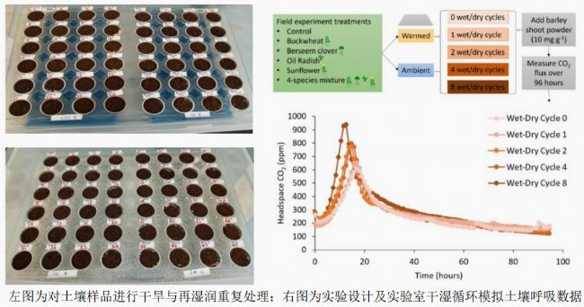 基于上述考慮,Adetunji等人設(shè)計(jì)了一個實(shí)驗(yàn)序列,用于研究升溫和覆土作物條件下土壤微生物對干濕循環(huán)的響應(yīng)及變化,相關(guān)過程和結(jié)果見下。