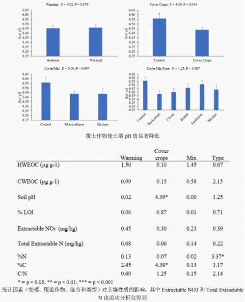 由左圖可以看出變暖和覆土作物對累積呼吸沒有顯著影響,但覆土作物多樣性(混合)和物種(類型)對每個周期的土壤都有顯著影響。由右圖可以看出與0個干濕循環(huán)相比,8個干濕循環(huán)后,變暖顯著降低了累積呼吸增加的程度,然而,與0個干濕循環(huán)相比,覆土作物顯著增加了8個重復(fù)干濕循環(huán)后累積呼吸增加的程度。