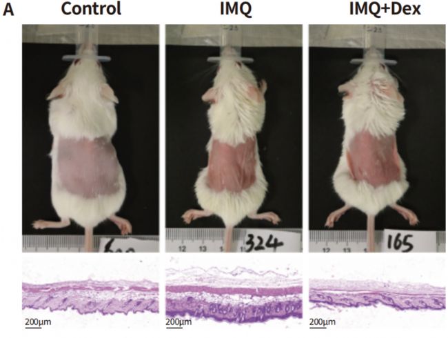 咪喹莫特(Imiquimod,IMQ)誘導(dǎo)的小鼠模型是研究銀屑病的經(jīng)典模型之一,該模型不僅較好地模擬了銀屑病樣的皮損表現(xiàn),也一定程度地存在與銀屑病相似的固有免疫和獲得性免疫紊亂。