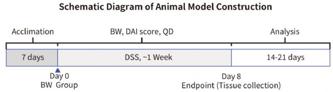 葡聚糖硫酸鈉鹽(DSS)常被用于誘導(dǎo)產(chǎn)生IBD模型,DSS不能被結(jié)腸上皮細(xì)胞直接吸收,但可破壞上皮細(xì)胞間的緊密連接,損傷基底膜,促進(jìn)腸道菌群和抗原滲入,誘導(dǎo)炎癥反應(yīng)。低濃度的DSS能夠誘導(dǎo)小鼠慢性潰瘍性結(jié)腸炎,高濃度的DSS能夠誘導(dǎo)小鼠急性潰瘍性結(jié)腸炎癥狀。