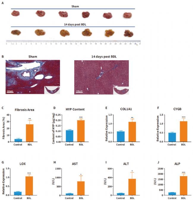 膽管結(jié)扎(BDL)導(dǎo)致膽汁淤積,引起局部肝組織損傷,是研究膽汁淤積型肝纖維化的經(jīng)典動(dòng)物模型。膽總管阻斷14天可形成肝纖維化,28天則形成肝硬化。