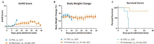 圖13. 急性GvHD模型驗(yàn)證。 M-NSG雌性小鼠 (n=6,6-8周齡)經(jīng)過(guò) 1Gy輻照后接種1E7 huPBMC細(xì)胞, 誘發(fā)急性GvHD,小鼠在給予阿巴西普(Abatacept)治療后,存活率明顯增加。