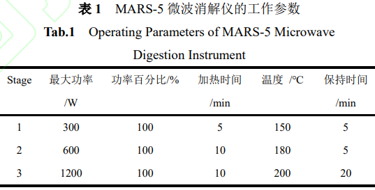 樣品前處理采用微波消解儀,配備了16個(gè)低容量全氟烷氧基(PFA)襯里的微波消解罐,并帶有安全破裂構(gòu)件(最大工作壓力為1380kPa)。磁控管在滿功率運(yùn)行時(shí),可輸出約1200W的2450MHz微波。工作參數(shù)如下表所示。