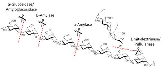 β-淀粉酶(EC 3.2.1.2)是一種外切酶,從α-1,4寡糖和非還原端的淀粉多糖片段中切割麥芽糖單元。